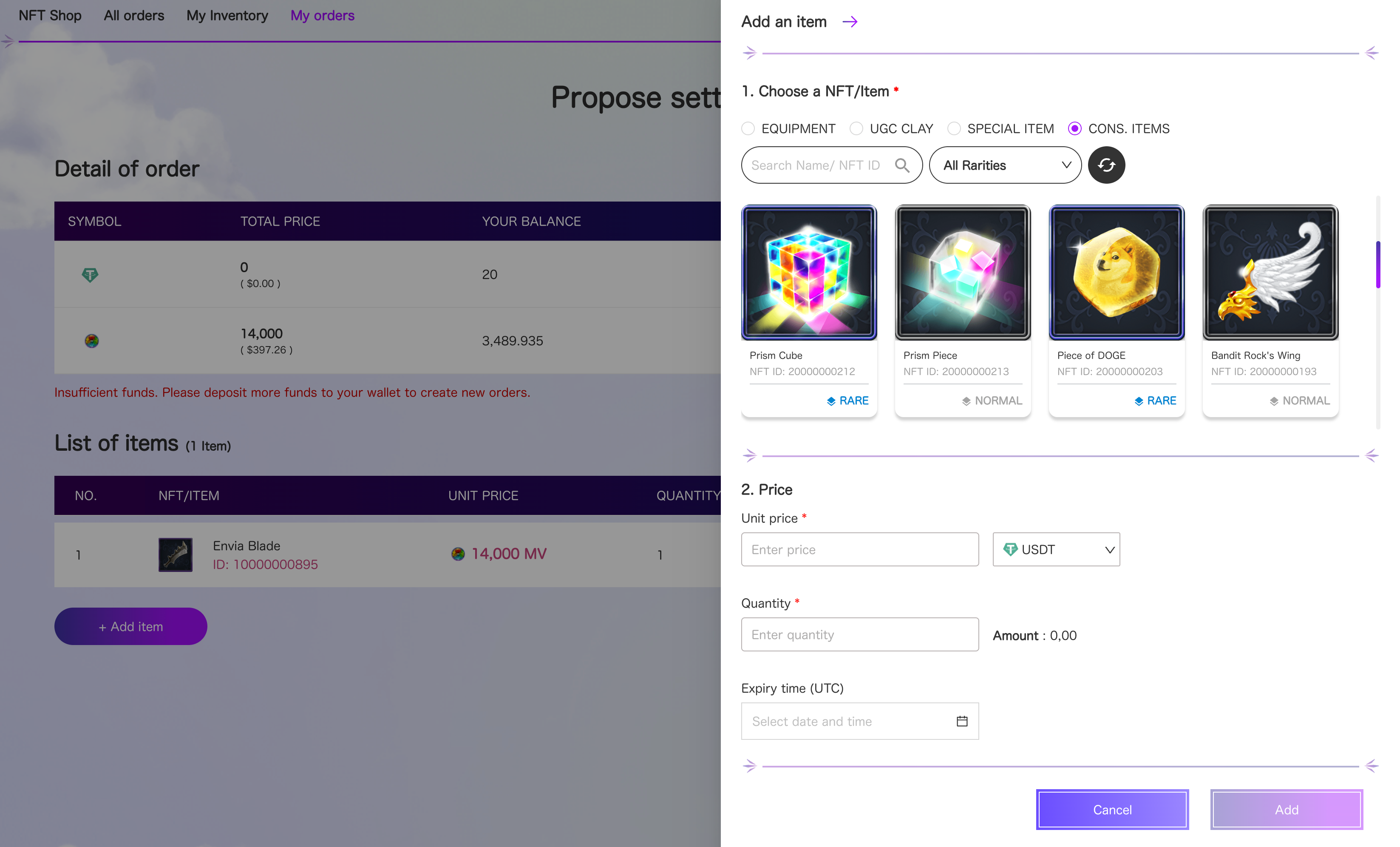 ① Access the newly added "My Orders" section, create an order → Click the "Add Item" button, select the NFT you wish to purchase from the list, enter how much and how many you want to buy, then press the "Confirm" button to create your order list.