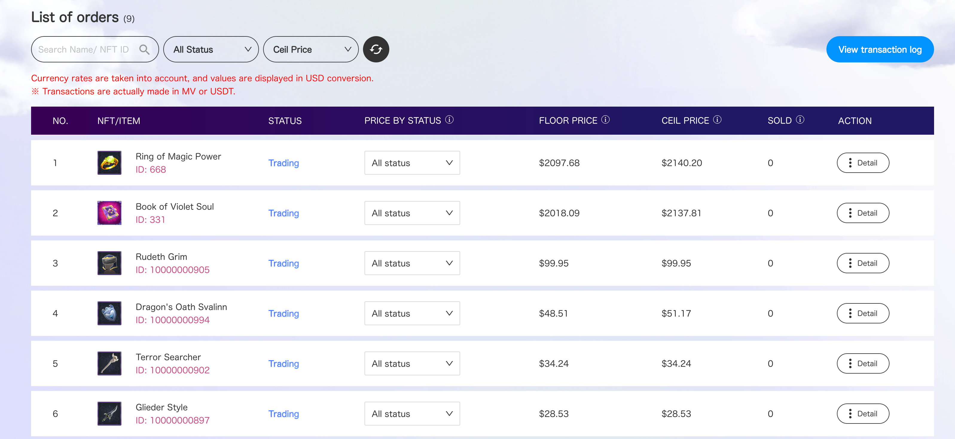 ② As there may be multiple orders for the same type of item, find one that meets your criteria from among all orders and press the sell button. In cases like equipment, there may be specific conditions such as a minimum strength requirement, so if your NFT does not meet these conditions, you may not be able to press the sell button.