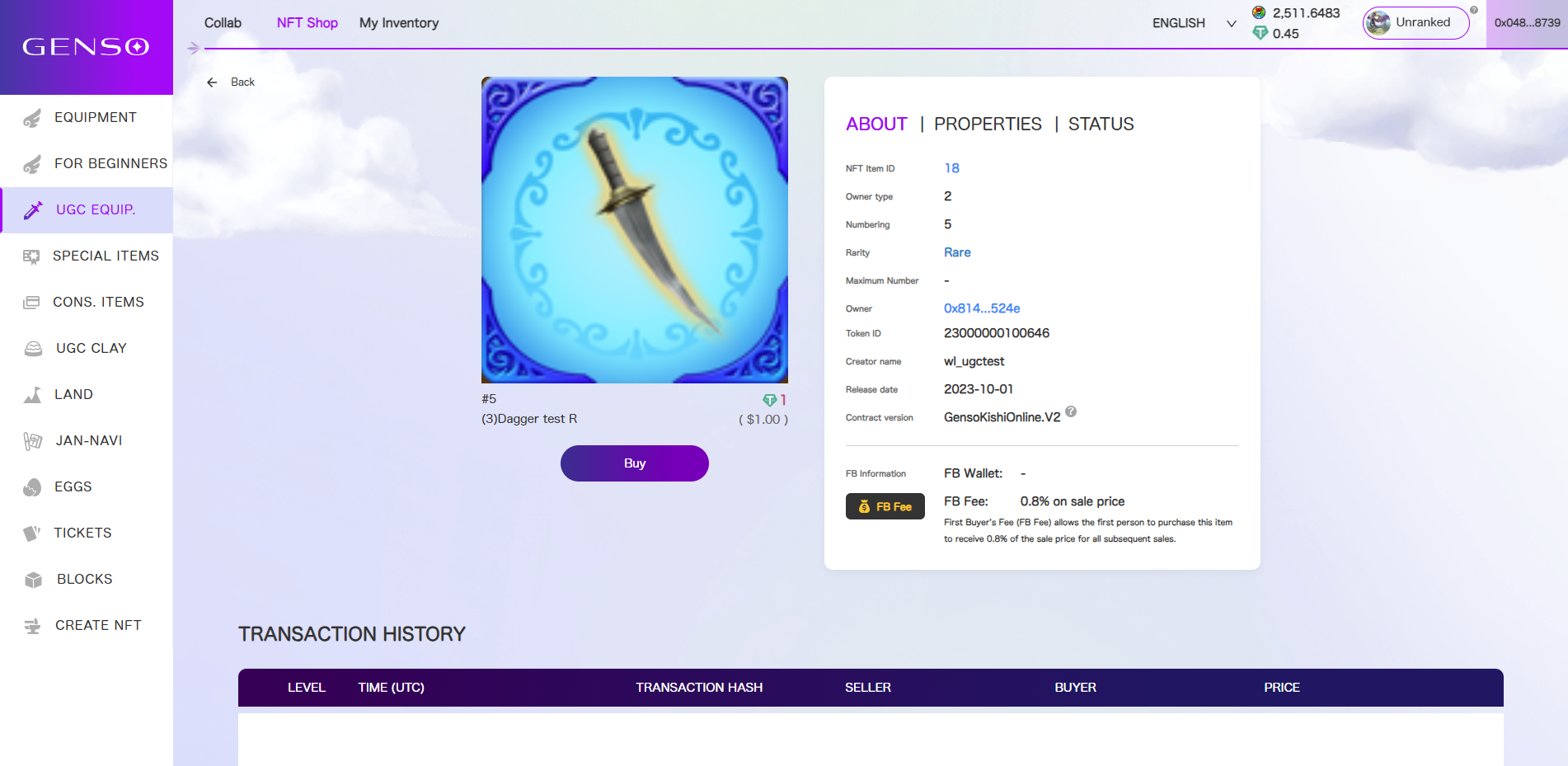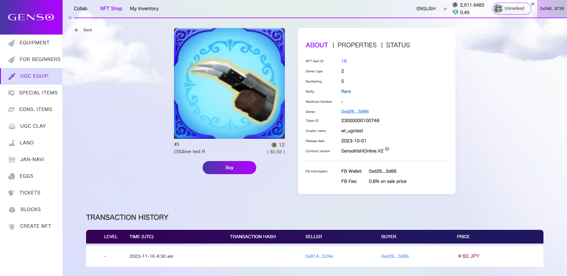 Furthermore, NFTs in the UGC equipment list screen that display the "FB Fee" icon in their thumbnails are NFTs to which the 1stBuyerFee has not been applied. You can also check the applicability of the 1stBuyerFee on the list screen.