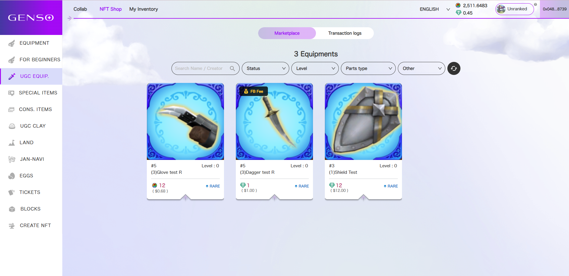 CreatorFee (3%) and 1stBuyerFee (0.8%) will be added to NFT equipment created by UGC (User-Generated Content). CreatorFee is a fee that will be distributed to the creators of the NFT equipment. On the GENSO Marketplace, whenever NFT equipment is bought and sold through secondary transactions, 3% of the transaction amount will be distributed to the creator of that NFT equipment.