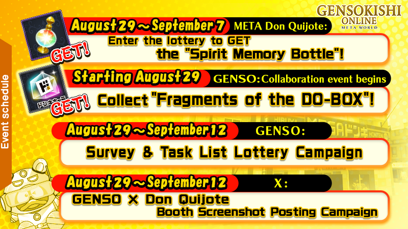 We will be holding an AMA (Ask Me Anything) session on X Spaces with the official accounts of GENSO Meta (@genso_meta) and Don Quijote (@metadonki) to discuss the upcoming collaboration event!