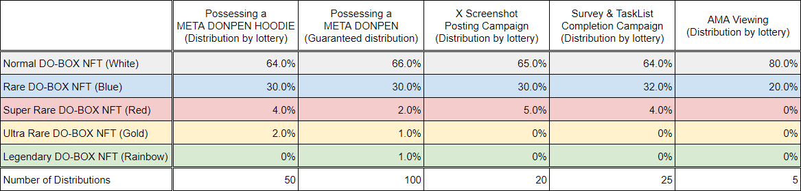 ・The rarity of the DO-BOX NFT you receive will be determined by lottery, according to the probabilities listed below (details of each campaign will be provided later).