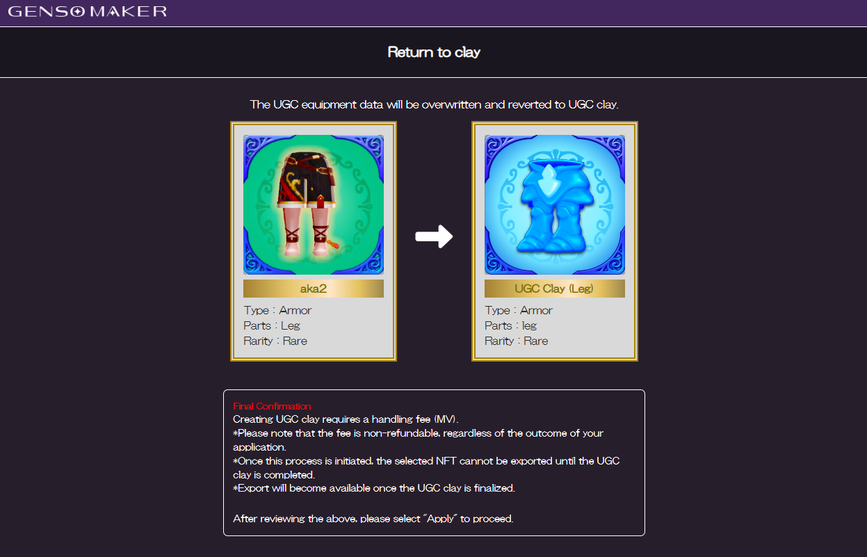 This function is intended to help users who have, for example, listed an item on the marketplace but were unable to sell it, or who made a mistake during creation resulting in an unintended item. By reverting such UGC equipment to clay, users can utilize it for creating new UGC content.