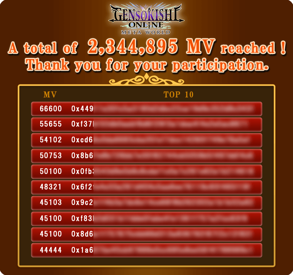 We received a total of 2,344,895MV (which includes the 175,754MV that are to be refunded based on the auction rules) worth of bids. We are very pleased to have successfully completed the 2nd NFT Auction as well as the 1st NFT Auction.