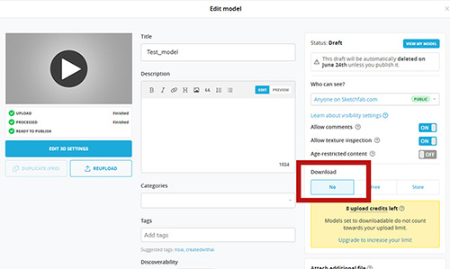 6.On the right side of the "Edit model" screen, under the "Download" section, select "NO" and click on "PUBLISH".